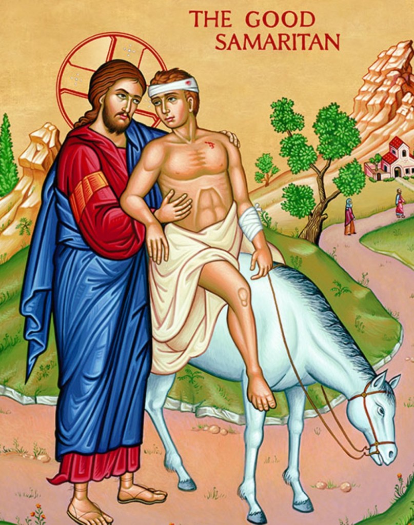 But the man was anxious to justify himself and said to Jesus, ‘And who is my neighbour?’ Jesus replied, ‘A man was once on his way down from Jerusalem to Jericho and fell into the hands of brigands; they took all he had, beat him and then made off, leaving him half dead. Now a priest happened to be travelling down the same road, but when he saw the man, he passed by on the other side. In the same way a Levite who came to the place saw him, and passed by on the other side. But a Samaritan traveller who came upon him was moved with compassion when he saw him. He went up and bandaged his wounds, pouring oil and wine on them. He then lifted him on to his own mount, carried him to the inn and looked after him. Next day, he took out two denarii and handed them to the innkeeper. “Look after him,” he said “and on my way back I will make good any extra expense you have.” Which of these three, do you think, proved himself a neighbour to the man who fell into the brigands‘ hands?’ ‘The one who took pity on him’ he replied. Jesus said to him, ‘Go, and do the same yourself.’